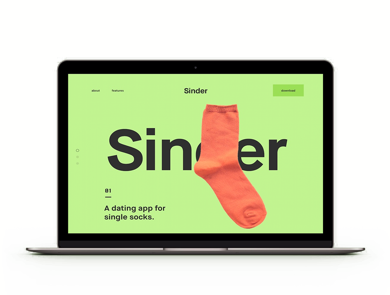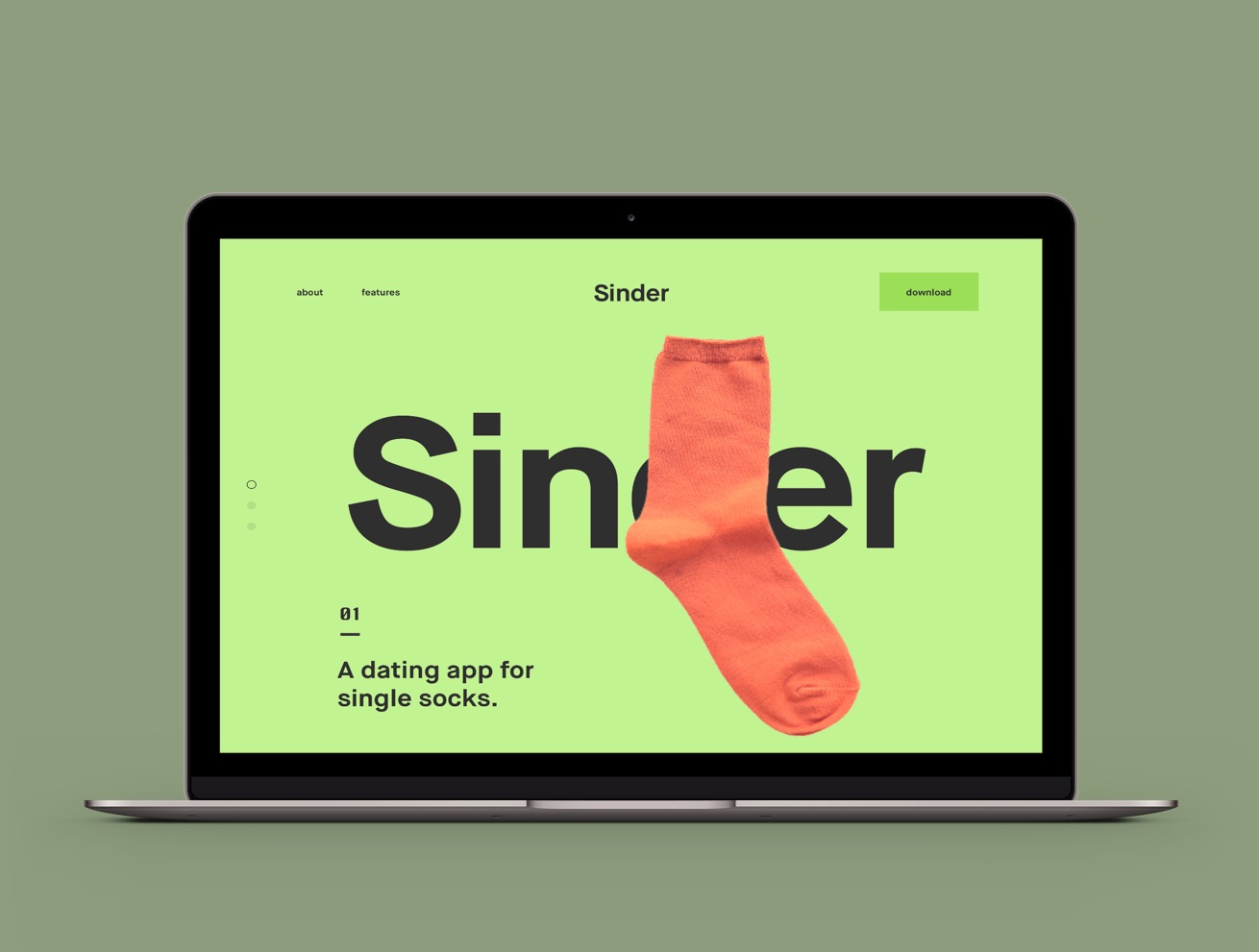 Sinder is a dating app for single socks. The design concept stems from the mission of the company: to help single socks meet their match. Simple, elegant, and cheerful tones convey the optimism of this company's mission.